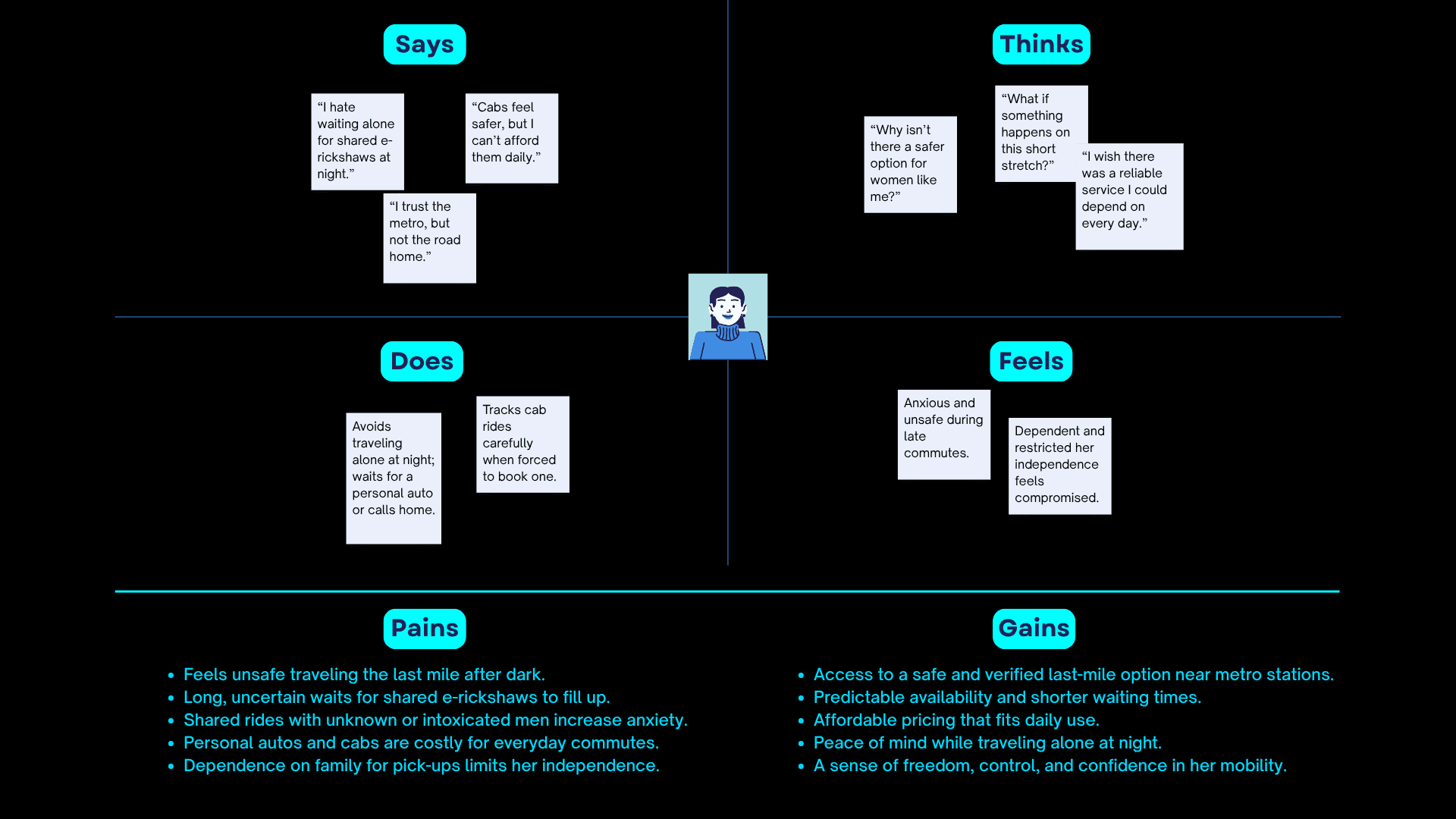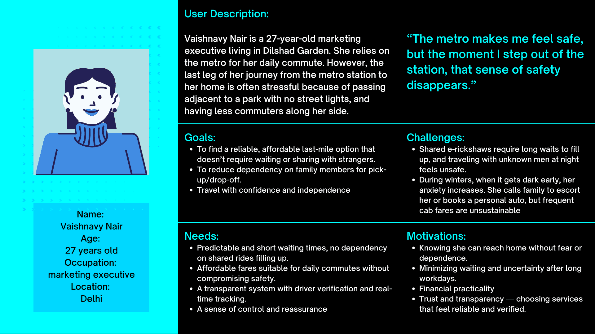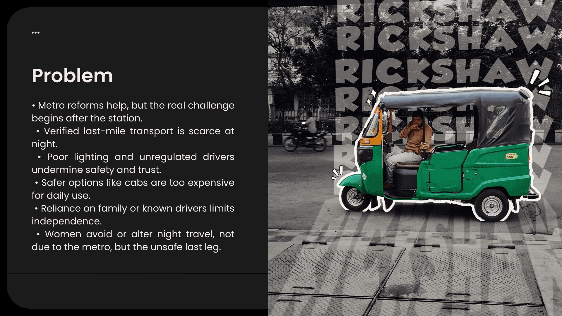It proposes verified, women-centric, and affordable last-mile ride options integrated directly into the metro ecosystem to make the journey from station to home safer and more predictable.